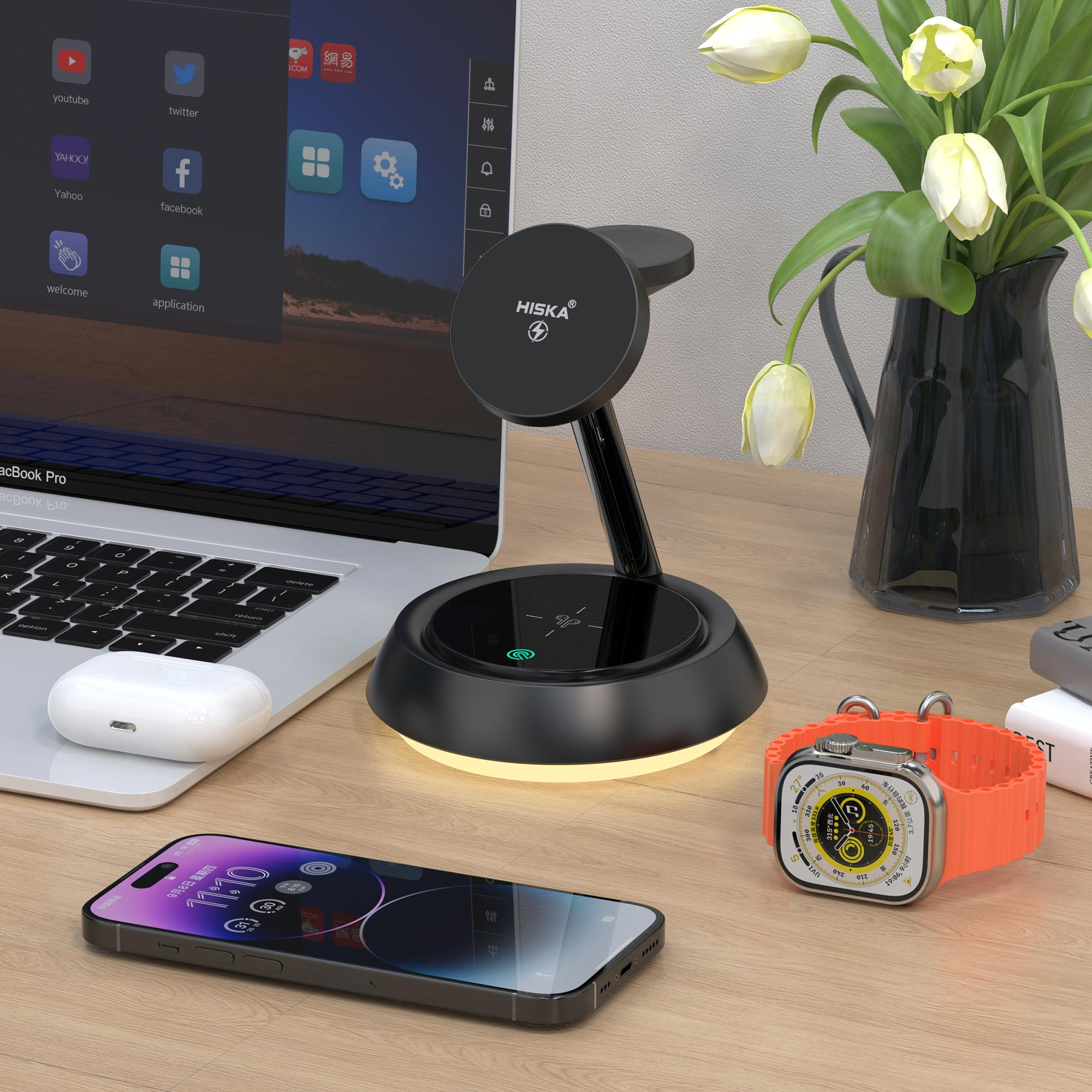 تصور کنید تنها با یک پایهی ظریف و مدرن، همزمان گوشی هوشمند، ساعت دیجیتال و هندزفری بیسیمتان را شارژ میکنید—بدون سیم، بدون شلوغی، و با سرعت بالا. شارژر بیسیم HISKA مدل HR-13 برای کسانی طراحی شده که به نظم، زیبایی و عملکرد اهمیت میدهند. این محصول با طراحی مینیمال، نور شبانهی ملایم و فناوری شارژ تطبیقی، تجربهای متفاوت از شارژ روزمره را رقم میزند.
