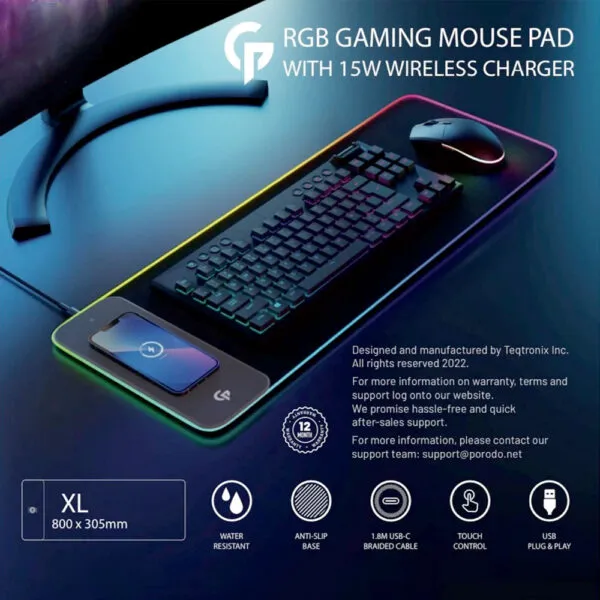 Porodo Gaming PDX115 RGB Gaming Mouse Pad With 15W Fast Wireless Charger