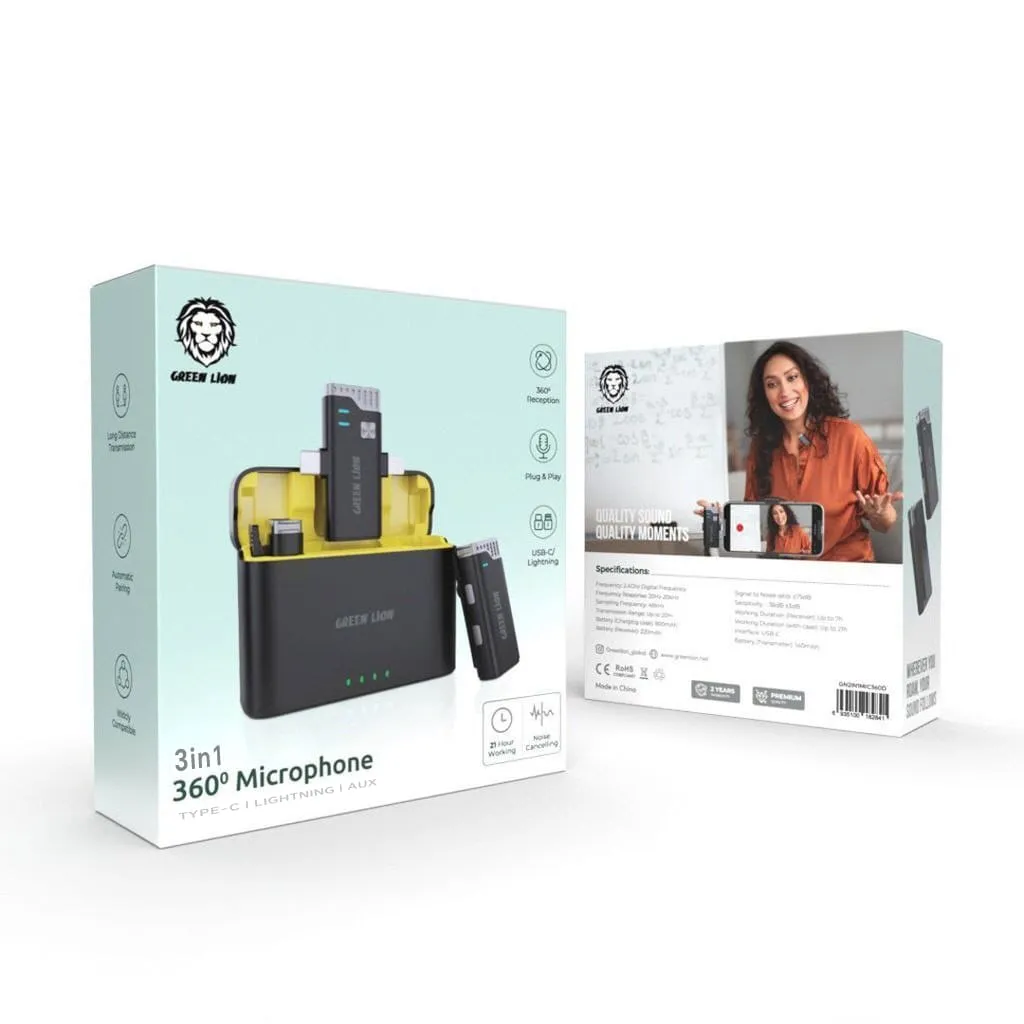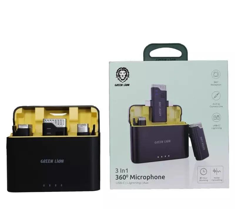Green Lion 3 IN 1 360 Microphoneدر دنیای تولید محتوا، گفتوگوهای آنلاین، ویدیوهای آموزشی یا حتی مصاحبههای میدانی، کیفیت صدا اولین چیزیست که مخاطب حس میکنه—و درست همون چیزیه که باعث تفاوت بین آماتور و حرفهای میشه. میکروفون 360 درجه گرین لاین مدل 3in1 یک میکروفون یقهای وایرلس قدرتمند با طراحی omni-directional (الگوی قطبی همهجهته)ست که صدا رو از هر زاویهای با وضوح بالا دریافت میکنه. پشتیبانی از سه نوع رابط (Lightning، Type-C و AUX) باعث شده تا این میکروفون برای هر نوع دستگاهی—from گوشیهای اندرویدی و آیفون تا دوربینهای فیلمبرداری حرفهای—کارایی کامل داشته باشه.